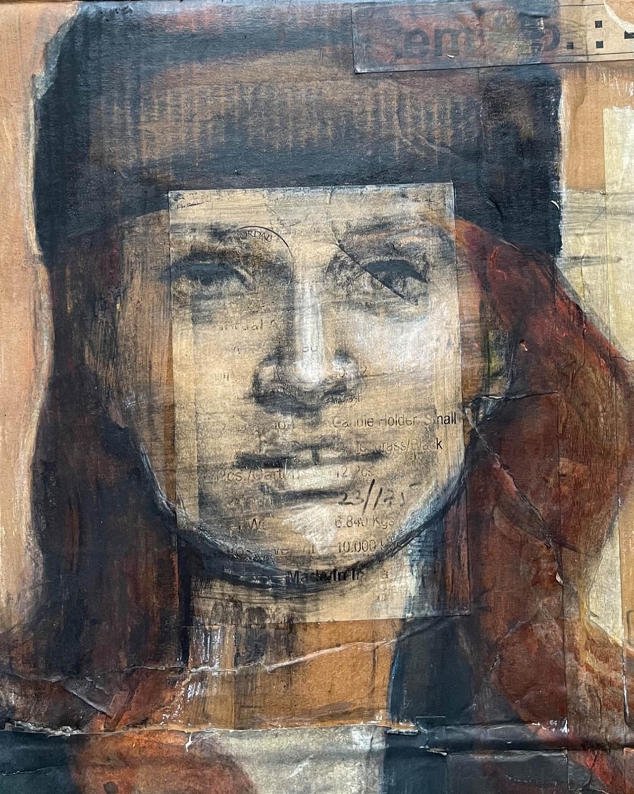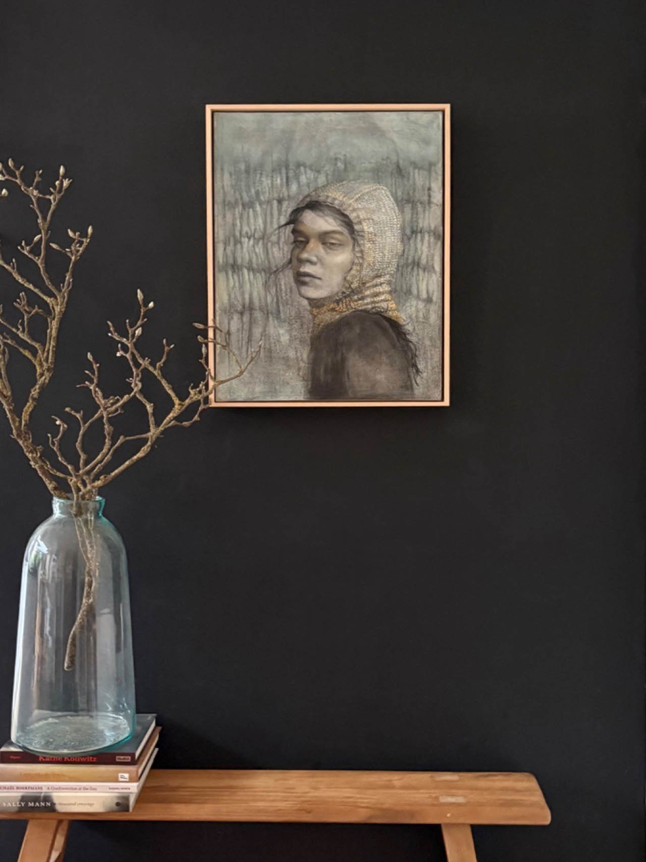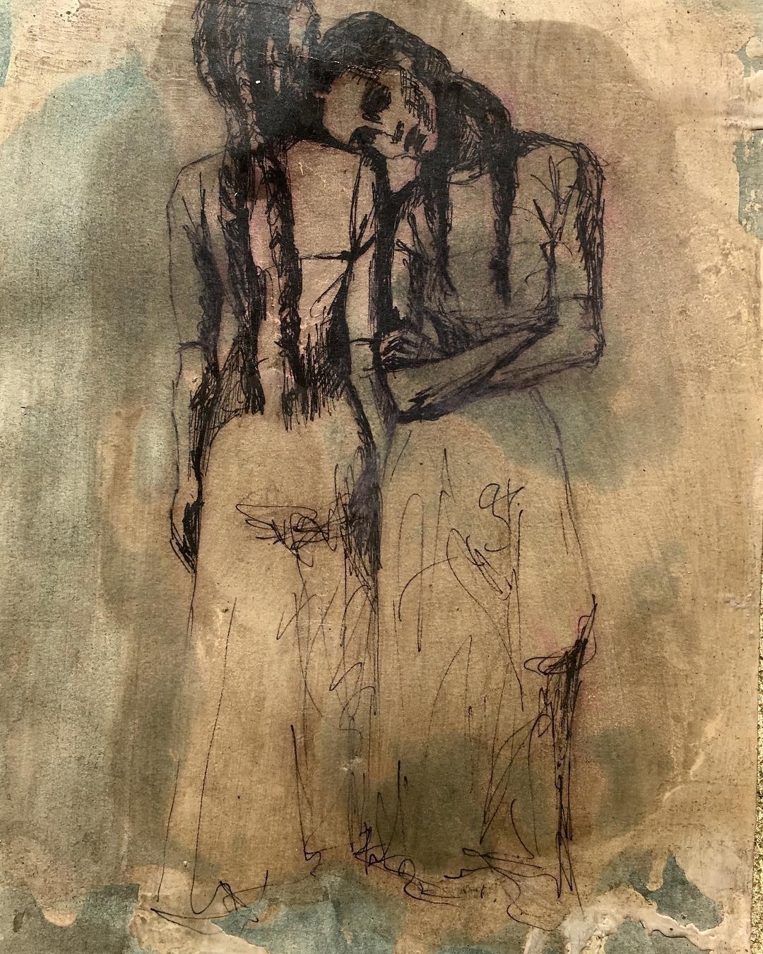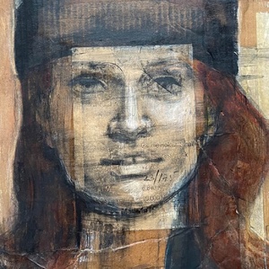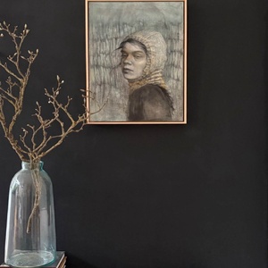 Mixed media containing gouache, graphite and charcoal on pre-treated paper stretched over a wooden frame.