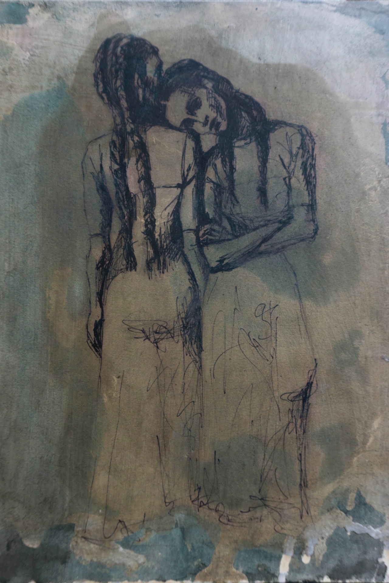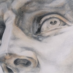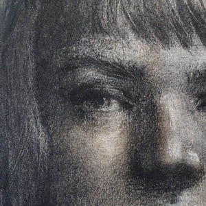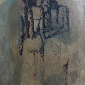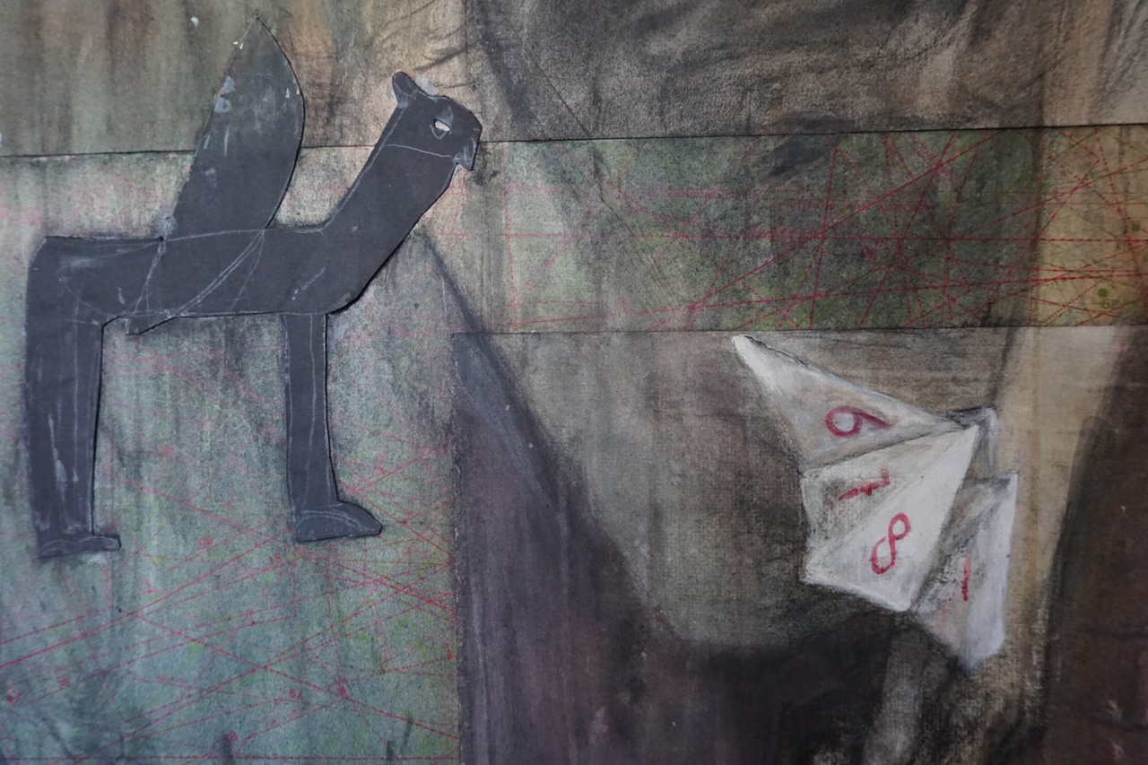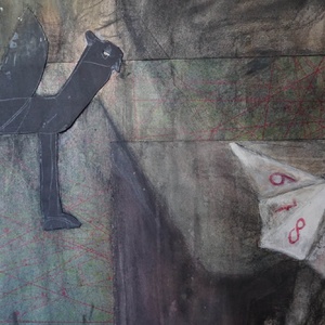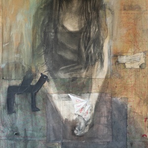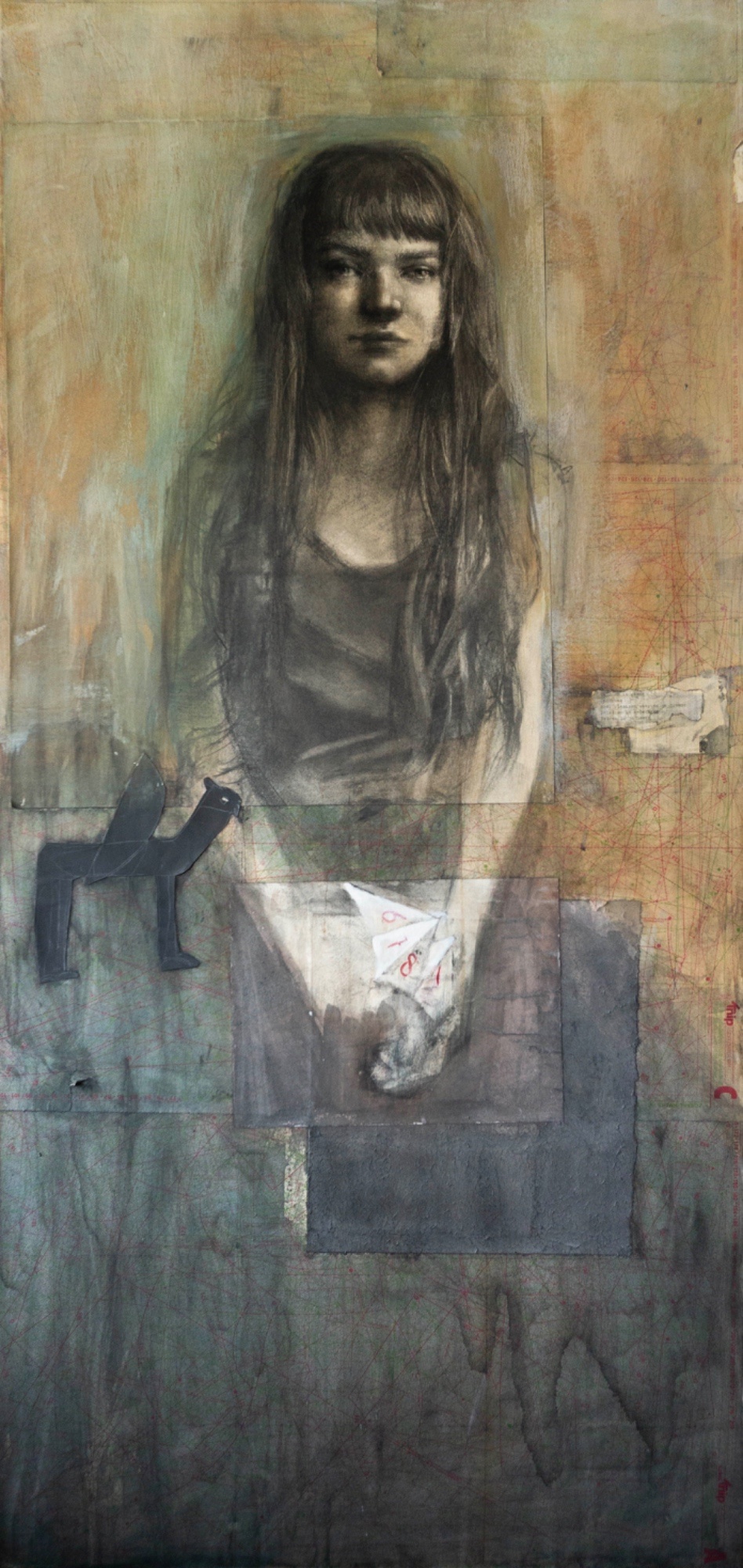 Mixed media containing gouachegraphite and charcoal on pre-treated paper stretched over a wooden frame.