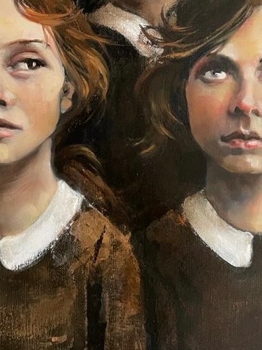 A young woman wears a knitted balaclava whose coarse stitches and design are somewhat reminiscent of a chainmail. A coat of armor made out of wool. Behind her, the outside world shrinks and is pulled together like the folds of smocked fabric.